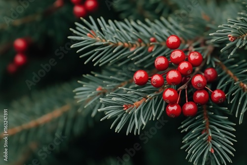 Closeup view of red berries on evergreen branches. Evergreen foliage with clusters of vibrant red berries. Natural details of winter plant. Beautiful natural texture. Seasonal plants perfect for