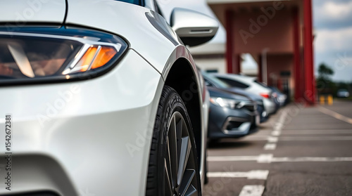 car, automobile, vehicle, transportation, parking, row, building, exterior, headlamp, tire, wheel, road, pavement, sky, daytime, closeup, modern, automotive, luxury, style, design, detail, metallic, silver, white, grey, shadow, urban, travel, scene, perspective, car park, transport, commercial, street