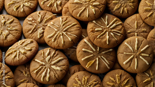 cookie, closeup, texture, pattern, row, arranged, baked goods, dessert, sweet, spice, cinnamon, nutmeg, molasses, homemade, free-range, golden brown, chewy, bakery, high-quality, detailed, food photography, rustic, warm, comforting, classic, epicure, artisanal, delicious, aromatic, appetising, fresh, intricate, brown sugar, snack, winter, festive