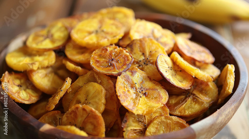 Close-up view of traditional jamaican snack cuisine: golden fried plantain chips in a rustic wooden bowl