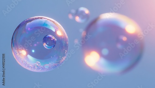 Close-up view of transparent soap bubbles floating in soft light with reflections and colorful highlights creating a dreamy and delicate atmosphere