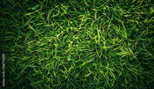 Close-up view of vibrant green grass texture. Healthy, lush blades in various shades of green