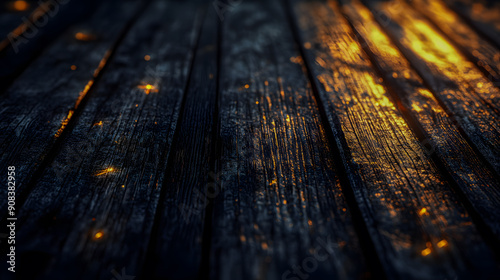 Closeup view of weathered and rustic wooden planks with a warm glowing and radiant texture illuminated by dramatic lighting that creates a moody atmospheric and ambiance