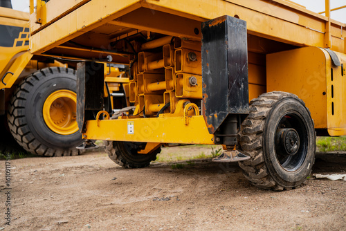Close-up view of yellow scissor lift chassis and wheels on construction site showing mechanical components and heavy-duty industrial equipment