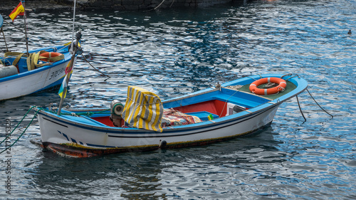 Closeup White Wooden Fishing Boat Moored in Glittering Water on the Beach, North Atlantic Ocean