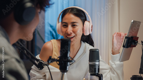 Close-up Young happy Asia couple wear headphone sit on desk online live streaming football live score watch soccer sport game on laptop use microphone talk with follower small studio in home at night.