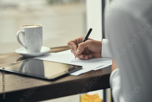 Close-up. Young man. Pen in hand. The tablet. Documentation. Job. Office. A cafe