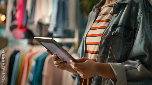Clothing Store Female Visual Merchandising Professional Uses Tablet Computer To Create Stylish Collection Fashionable Shop Sales Retail Assistant Checks Stock Small Business Owner Orde : Generative AI