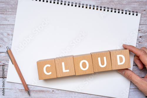 クラウドのイメージ|「CLOUD」と書かれたブロック、ノート、ペン、手