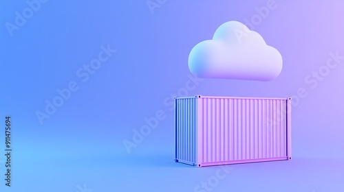 Cloud computing concept. Digital cloud hovering over a shipping container in vibrant blue and purple color gradients.