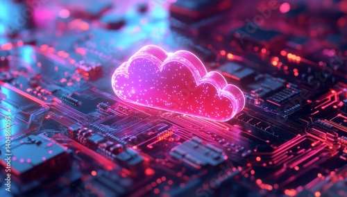 Cloud computing on a circuit board. Dynamic glowing cloud graphic on a complex electronic circuit. Abstract illustration of data processing and storage in the cloud