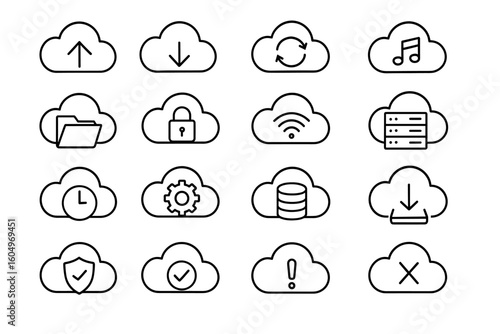 cloud, technology, icon, upload, download, sync, music, security, datum, folder, lock, server, time, gear, database, shield, check, alert, error, network, symbol, outline, collection, interface, digital, cyberspace, storage, setting, device, update, connection, application, media, computing, backup, vector, icon