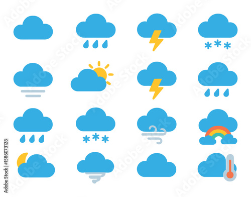 cloud, weather, symbol, rain, thundercloud, snow, fog, sun, lightning, modern, flat, style, storm, raindrop, snowflake, wind, rainbow, moon, tornado, mist, temperature, gauge
