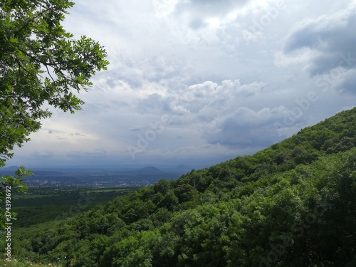 landscape, mountain, caucasia, sky, cloud, green, nature, blue, forest, cloud, mountain, tree, view, tree, hill, summer, vale, panorama, grass, travel, beautiful, scenic, wood, sun