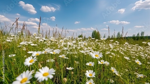 Cloudy blue sky, green grass, wild meadow flowers and daisy field. Natural landscape with copy space. Generative ai