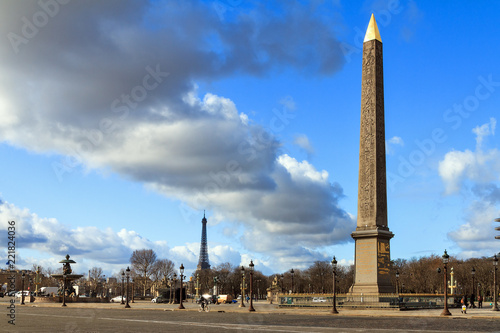 Cloudy day at the place de la Concorde with the Obelisk and Eiffel tower, in Paris, France.