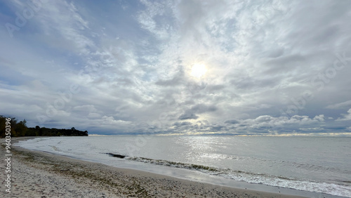 Cloudy day on Ontario Lake beach in South Oshawa, Ontario