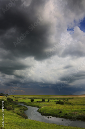 Cloudy summer landscape with small river.Dark stormy clouds in dramatic overcast sky.Fields,green meadows and woods.Rainy season.