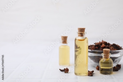 Clove oil in bottles and bowl with dried buds on white tiled table, space for text