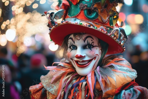 clown, costume, make-up, colourful, festive, hat, joy, smile, performance, circus, entertainment, light, parade, whimsical, artistry, cheerful, character, fun, accessory, creativity, vibrant, holiday, celebration, red, yellow, blue, orange, expression, crowd, portrait, joyfulness, playful, festival, happiness, attire, tradition, fantasy, humor, spirit, personality, high-coloured, bright, eye-catching, theatrical