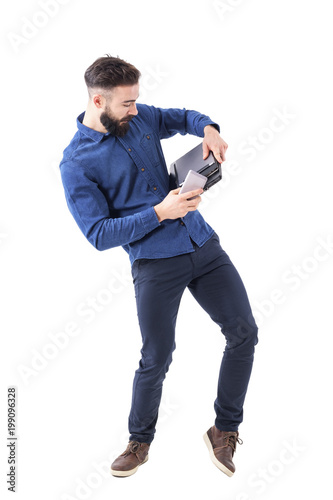 Clumsy young bearded businessman holding laptop, tablet and cell phone from falling down. Full body isolated on white background.