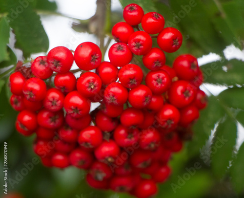Cluster of bright red berries on a rowan tree selective focus