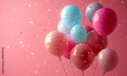 Cluster of colorful balloons with confetti on a vibrant pink background for celebration