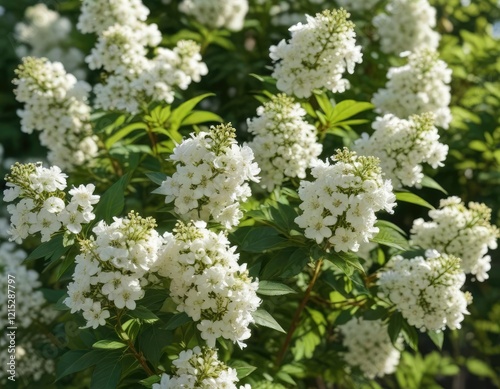 Cluster of fragrant white spirea flowers on a sunny day, bush, white, sunny day, flowers