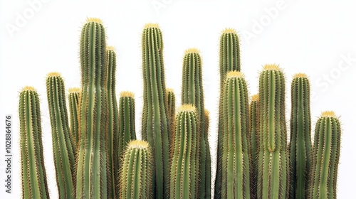 Cluster of Tall Columnar Cacti with Ribbed Greenish-Brown Stems Against Plain White Background, Multiple Arms Extending Upwards with Slight Curvature, With Intricate Details and Textures