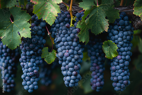 Clusters of ripe grapes hanging on vines