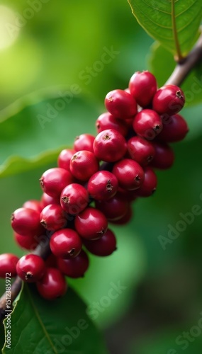 Clusters of ripening Arabica coffee cherries on branch, organic, nature
