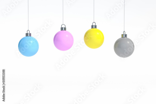 CMYK Color (cyan, magenta, yellow and black) of christmas ball Ornaments hanging on white background 3d rendering. 3d illustration color space minimal style christmas and happy new year concept.
