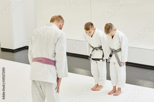 Coach in kimono tanding and greeting his students before lesson in the gym