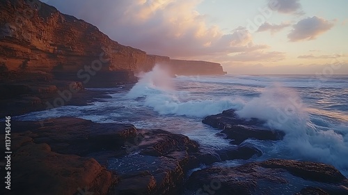 Coastal Cliffs Sunset Ocean Waves Crashing Rocks