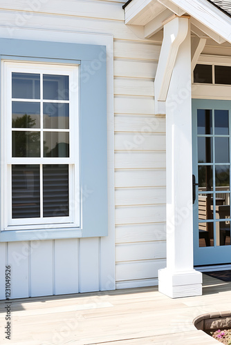 house, window, door, exterior, home, building, architecture, design, property, residential, structure, facades, style, entrance, porch, white, blue, wood, siding, light, classic, modern, renovation