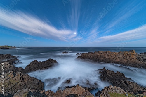 ocean, moon, rock, coast, wave, night, sky, cloud, dramatic, landscape, sea, shore, nature, water, long, exposure, motion, blur, light, dark, calm, beautiful, scenic, travel, view, photo, twilight, astronomy, star, moonlight, coastal, waterfall, shoreline, beach, beauty, evening, seascape, oceanic, wide