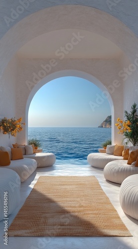 coastal, relaxation, seating, cushion, rug, beige, cream, yellow, flower, plant, archway, architecture, interior, design, modern, minimalist, calm, serenity, peace, calmness, sunlight, blue, water, horizon, landscape, view, peaceful, elegant, comfortable, furniture, decor, space, stylish, contemporary, balcony, exterior, breakwater, texture, warmth