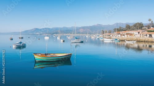 Coastal Rowboat Serenity Blue Water, Calm Harbor, Mountain View