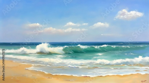 ocean, wave, shore, beach, sand, water, sky, cloud, sunlight, blue, turquoise, green, foam, white, crest, horizon, landscape, seascape, summer, breeze, gentle, splashing, sea, coast, nature, view, relaxation, calm, peaceful, painting, art, colours, impressionism, seacoast, gold, morning, afternoon, pastel, detail, texture, element, motion, light, warm, impressionistic, vibrant