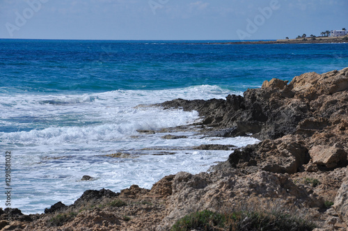 Coastal view showcasing rugged rocky cliffs meeting the vibrant blue ocean waves under a bright sky. Captures the essence of a serene seascape with the natural beauty of untouched shores.