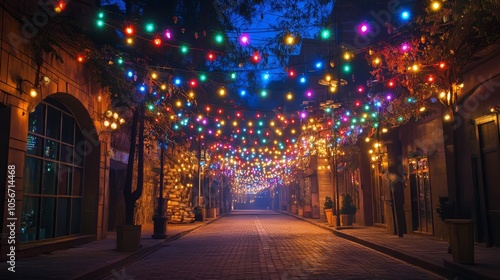 street, cobbled, light, colourful, string, night, dark, building, window, sidewalk, lamp, tree, branch, foliage, brick, doorway, lamp-post, glow, exterior, urban, alleyway, festive, illuminated, city landscape, atmosphere, ambience, evening, dusk, christmas, holiday, romantic, cosy, warm