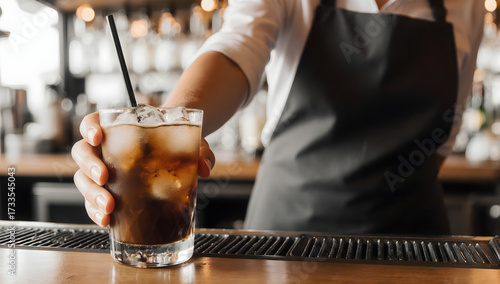 Cocktail Service: A professional bartender extends a chilled, refreshing beverage towards the viewer, a dark and inviting cocktail brimming with ice cubes, inviting enjoyment