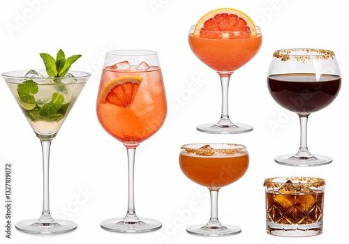 glasses, cocktail, drink, alcohol, isolated, juice, red, beverage, fruit, martini, white, cold, wine, ice, orange, liquid, food, strawberry, fresh, refreshment, bar, cherry, alcoholic, vodka, liqueur