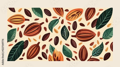 cocoa, bean, leaf, flat, vector, illustration, design, organic, natural, food, drink, ingredient, botany, plant, brown, green, botanical, art, chocolate, tropical, harvest, agriculture, farming, sustainable, healthy, aroma, exotic, texture, decorative, epicure, nutrient, fresh, quality, ripe, favor, sweet, bitter, seed, beverage, condiment, cooking, craftsmanship, culinary, delicious, farm, growth, harvesting