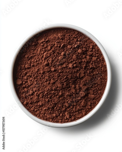 Cocoa powder in a white bowl on a white isolated background.