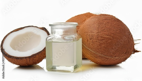 Coconut oil in a glass jar with coconut balls beside it, isolated on clean background. Showcasing the natural beauty and health benefits of this versatile ingredient