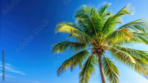 Coconut palm leaf tree against a clear blue sky , tropical, nature, palm tree, coconut, green, foliage, vibrant