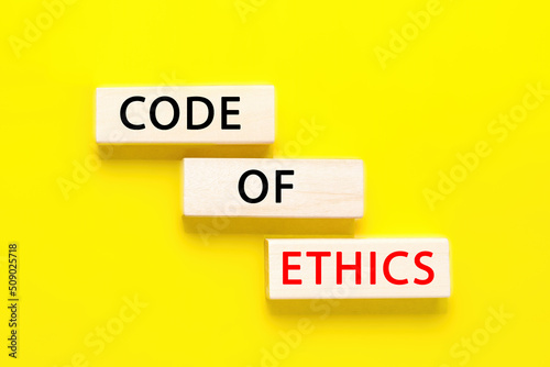 Code of ethics symbol. Concept words Code of ethics on wooden blocks on yellow background. Business and code of ethics concept.