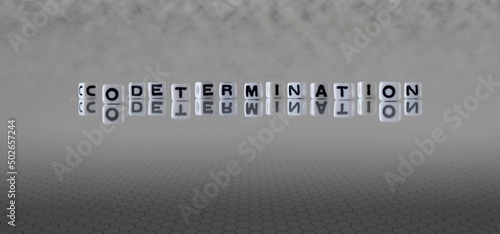 codetermination word or concept represented by black and white letter cubes on a grey horizon background stretching to infinity