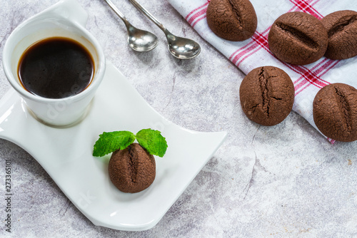 Coffee bean cookies with espresso coffee in a cup - high angle view